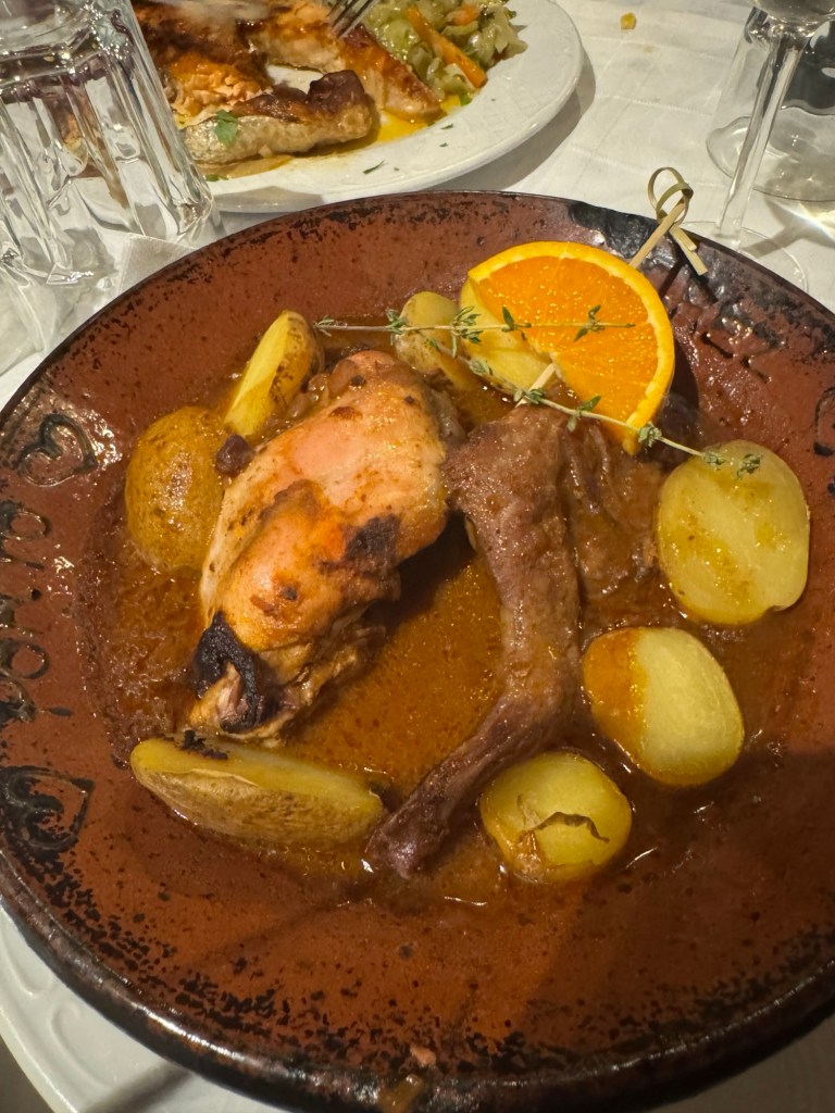 Open flame at the table seems dangerous when drinking lots of port and beer….and if you didn’t catch on from the name of the restaurant, tonight we are eating rabbit. I have never tried it and in my head I’m hoping for breast meat, but do rabbits have breasts? Apparently they do not, so I have some other piece of anatomy and a leg.